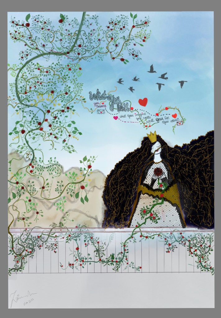 Me and Sophia had a wonderful relationship since childhood, it was like Sara and her doll from little princess Novel. We travelled everywhere togeather , we crossed oceans and seas, flew above different continents, from Iraq to Emirates, to Malaysia, and finally to our current and hopefully last destination : Munich in Germany. Sophia now has a grey hair, not because she is possessed if that was your first thought , but because i am stressed and do not have the usual time to wash her hair regularly like i used to do during those corona times and take care of here….nevermind,i take care of my small dolls as if they are my own kids…to avoid any flashbacks to be triggered by looking at Sophia near my bed, and to overcome my PTSD and not to feel so emotional during my PMS, i decided to keep her hidden, and not be revealed, Like a secret that i am not sure if i want to share it or just keep it to myself, just like that, I kept sophia hidden in my luggage. In 2022 during my Dental conversion exams, There were many times when I had,still having those flashbacks from my childhood with Sophia, those childhood’s days spent mostly parenting myself and Sophia, or excessive Studying, i had this flashback once that left me illustrating my thoughts by drawing me, but in my mind it was Sophia, because i liked to have this name, or any other name rather than Zainab, standing next to the meaning of the real name of her , a big beautiful tree, and birds flying everywhere around her, like a protecting angel or a god from the anicient stories, the unknown quote above her though was the perfect description of that moment, an endless description of small actions,thoughts , and even believes. It was this particular moment when I realised i want to use this name in all my imaginary scenarios and fictions texts.yes, I like writing sometimes fictional stories, or real life based stories with some fake names.I will leave it to your imagination and Brain, to think and try to figure , to interact and put that last photos of puzzle in it’s place, between imagination and reality is a very thin line … wether you swam in your reality or imagination, let it be a part of that world of you. I will sleep like a kid waiting of Santa or a tooth fairy, close my eyes and pray : May you and me have a better connection with our thoughts ….. may you and me grow up together having green fields …