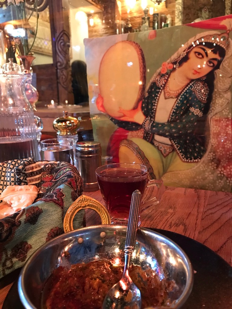my food arrived , the taste of the warm tea with Saffron and the Plant sugar was amazing, the taste of the tea combined with the Eggplant dips exploded some kind of emotions in me . it took me years back to a random winter night beside the oil heaters in the kitchen when there was no electricity and an a simple oil lamp lightened the room at night, in moments like these i try to block my mind out from overthinking or experiencing a deep hidden flashback, i distracted myself from this memory from the past and decided instead to pay for my food and leave the place …